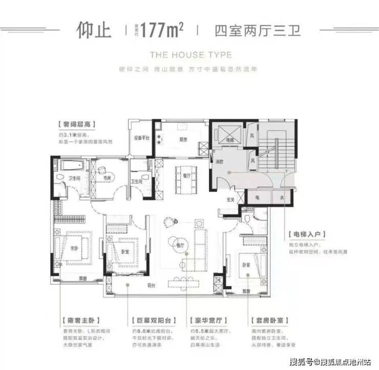 以建面约177㎡四房两厅三卫户型为例,可以说是精准戳到了高端改善人群的心尖尖上。