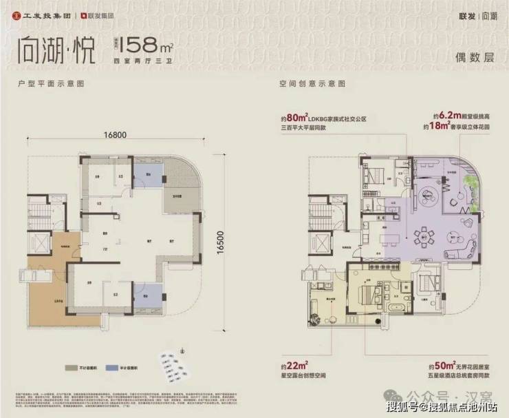 该户型为A-3、A-4号楼奇数层,南北通透,三面采光,南北双阳台,独立电梯前室,带约270°空中花园+180°北露台,得房率非常高。