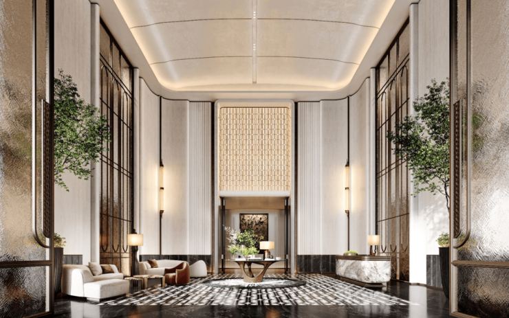 尚滨道由大师执笔打造天际地标,搭配现代璀璨美学外立面,形成白鹅潭滨江独特视觉符号;内在从美学艺术理念上去打造生态、园林、礼遇到圈层层层递进——如以慢行步道串联“揽园”共享花园、18万㎡滨江公园与广钢中央公园,构建“一步公园两步江”的生态闭环,让自然融入日常;园林以“以百年敬百年”为核,打造“船奇艺园”20幕场景,精心编排了一场“岭南文化对话海派风格”的园林盛宴,归家动线同步嵌入立体景观;更以8重酒店式归家礼序为标准,甄选博物馆级石材匠造落客区与多重大堂,并配建约4000㎡酒店星级会所,从入园到圈层社交,全方位彰显塔尖尊崇。