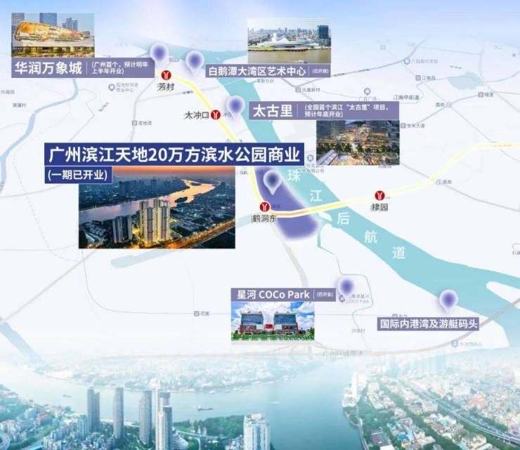 项目介绍:项目位于珠江后航道白鹅潭核心滨江带,独占2km黄金岸线,双央企联袂打造的125万㎡滨江综合体大城,涵盖总部双子塔、大型商业、住宅、超星级酒店、公园、学校、演艺中心、图书馆、博物馆、TOD轨道等多元业态。
