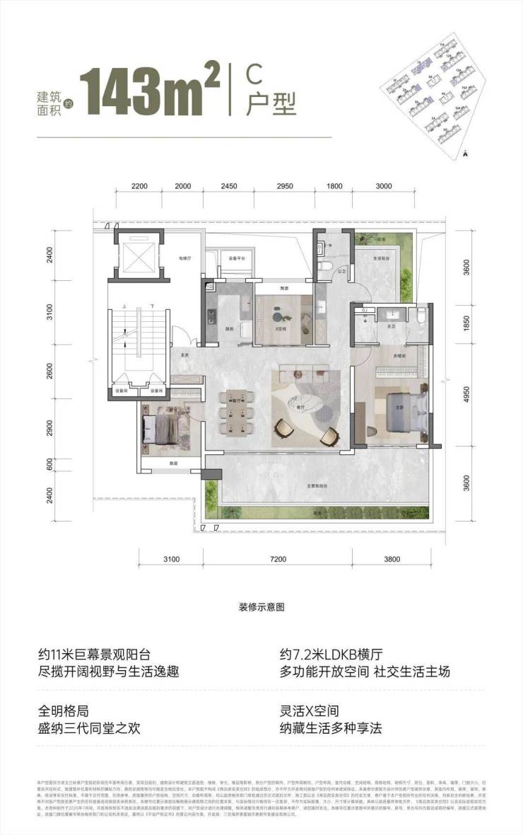 观岚二期规划了110㎡、131㎡、143㎡、195㎡的三至四房户型。每一款户型都经过精心设计,旨在重塑旅居生活的尺度。11层纯洋房规制,拒绝高楼压迫感;梯厅开敞化+光庭仪式长廊,让归家动线更加场景化;主卧小家化+全景落地窗,打造私域度假领地体感;LDBK一体化+越级尺度,重构无界生活场。特别是195㎡的创意全景舱户型,更是以N+超配功能,全新定义了度假全景舱的概念。