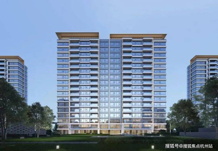 建筑外立面匠心层叠:基座局部石材,主体墙面玻璃、香槟金及灰色铝板配以高品质暖灰涂料,塑造现代雅致的立面风格形象。