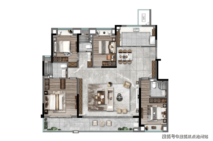 像这样的大平层户型,我想绝大部分开发商都会在房间数上面下文章,但建发御珑湾并没有这么做,而是只打造四房,且做的十分精彩: