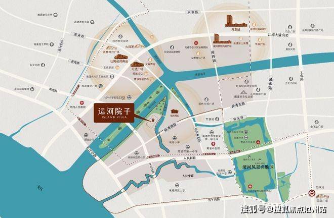 南通仅此五河交汇之处(通扬运河南段、通扬运河北段、通吕运河、船闸河与水闸河),以龙首之姿,构成南通罕见的三面环水岛居形态。生活于此,既在繁华之中又能奢享静谧,享受自然合围的舒居环境。
