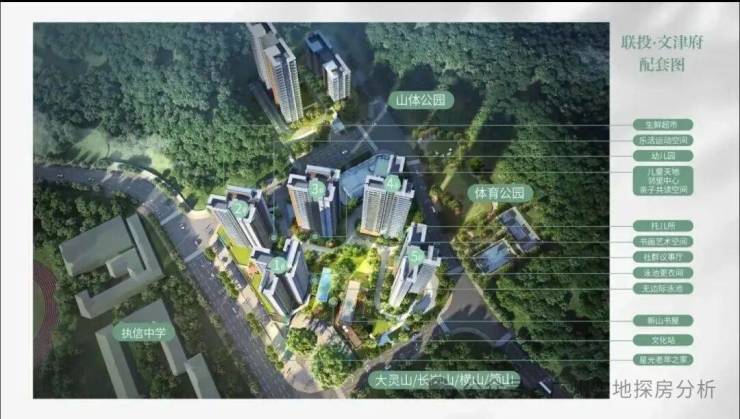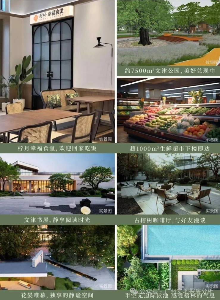 项目因地制宜,保留原生地脉上的6棵古榕,打造7500方的文津公园,社区内部有儿童天地、静修空间、邻里中心、社群议事厅、共享会客厅、亲子共读空间、书画空间、乐活运动空间。周边大灵山、长岗山、横山、简山。山体公园、天河区儿童公园、岐山公园、天河大观湿地公园、广州科学城体育公园。