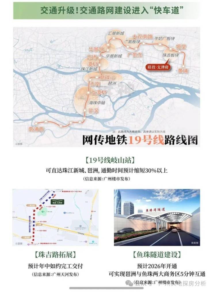 项目周边是没有地铁的,最近的21号线、4号线都去到了几公里外了。近邻地铁19号线珠吉站规划中、7号线2期姬堂站规划中。