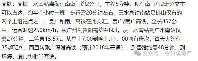 1高铁:三水南站距离项目南门约2公里,1站到广州,联通香港西九龙