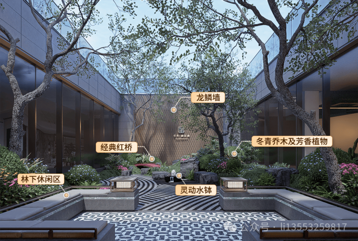 往里走,别有洞天的下沉庭院,利用6米高低落差,打造隐逸的会所空间。中心以“水聚天心”打造叠石理水的诗意园景,寓意财不外流,彰显人文祝福。