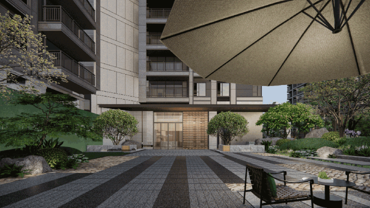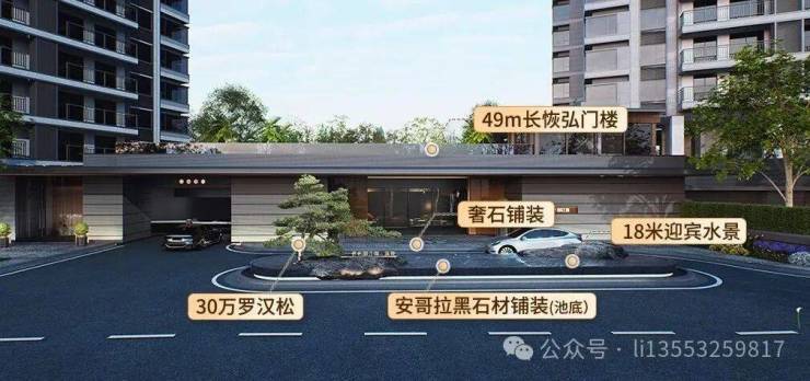 项目打造了现代中式隐奢酒店式落客区,约18米宽的镜面水景,如墨玉铺陈,赋予居者“引水招财”的美好祝愿。