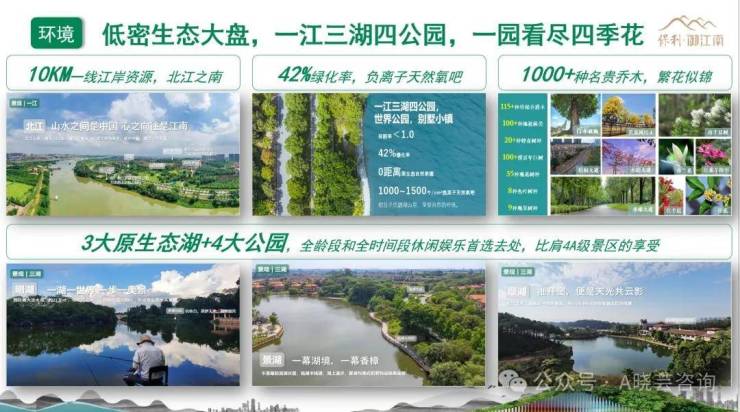 项目邀请国际顶级设计团队进行规划设计,在规划上保留了大量的原生态资源。斥资20 亿重金打造“1 江 3 湖 4 公园”的大园林景观:10 里的北江景观资源,三大原生态湖泊,邻近销售中心的 2.8 万㎡景湖;紧邻江南汇酒店 2 万㎡的翠湖;还有面积最大 21 万㎡的明湖;围绕明湖,还建有一个明湖公园,里面有一条 3 公里的环湖自行车道。