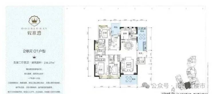 236.27㎡五室两厅四卫,户型方正,南北通透,实用主义空间布局;三面阳台,演绎明朗生活,高品质舒适享受;客厅和主双卧室均朝南向,充足采光,通风流畅;