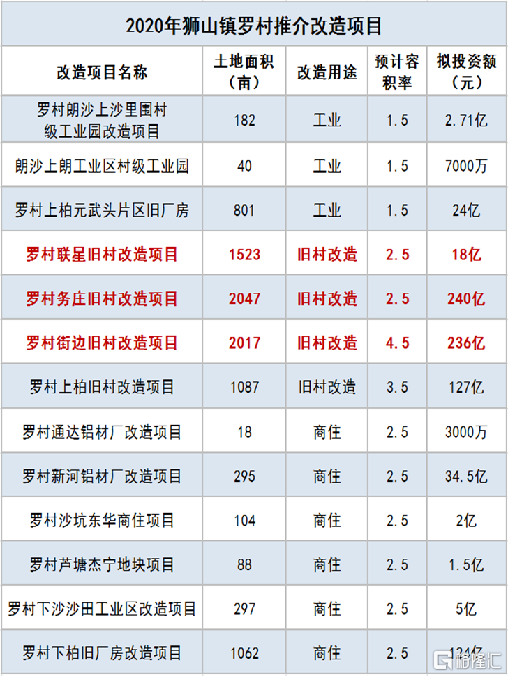 2020年罗村共13个旧改重点推介,改造面积较大超2000亩。