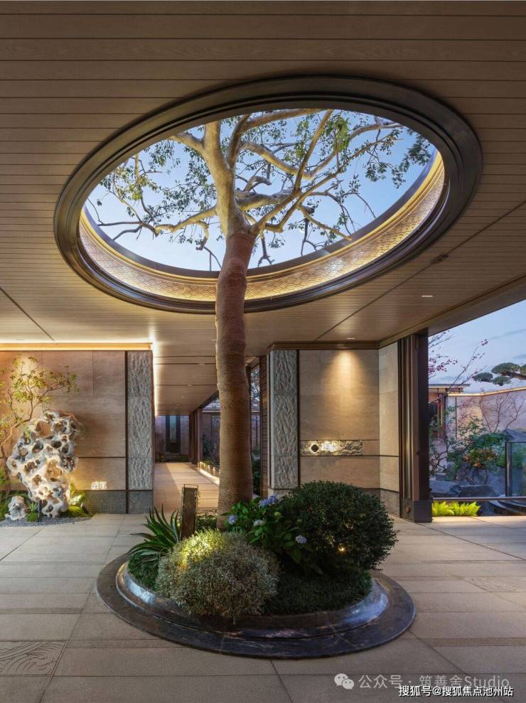 下沉庭院中水面如皱镜,倒映檐角、疏枝与银浪雕塑。水静默,将天光晕染成墨,风过处,涟漪轻触树影摇曳,是现代形意与传统水榭的静默对话。园中“空”境,皆浸于此汪柔水,裹挟江岸清润。精心构筑的园林,内部植满百年古木,营造出宛如现代的古典雅境。无论从哪个角度欣赏,都能沉浸于“诗中有画,画中有诗”的意境之中。