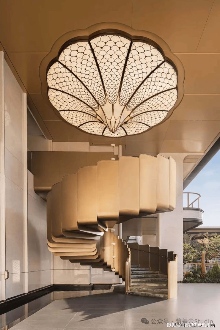 望潮洋房地块主大门气势恢宏,长达50米,高约10米,巧妙融合庑殿金顶与斗拱元素,并精选宝格丽金奢石点缀其间,既灵动飘逸,又尽显东方气派。檐角流淌的光影,交织着石材的温润与金属的微光,悄然印刻在景墙之侧。“望潮”之名,由此而生。步履踏阶,足尖轻碎的光斑,抬眼望处,檐下静谧的风,皆是园林的序章——不事张扬,唯以“藏锋”之姿,为低密住区铺陈出内敛而厚重的底色。