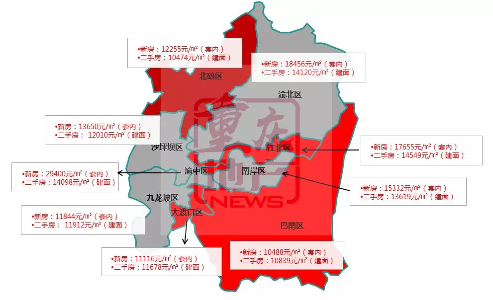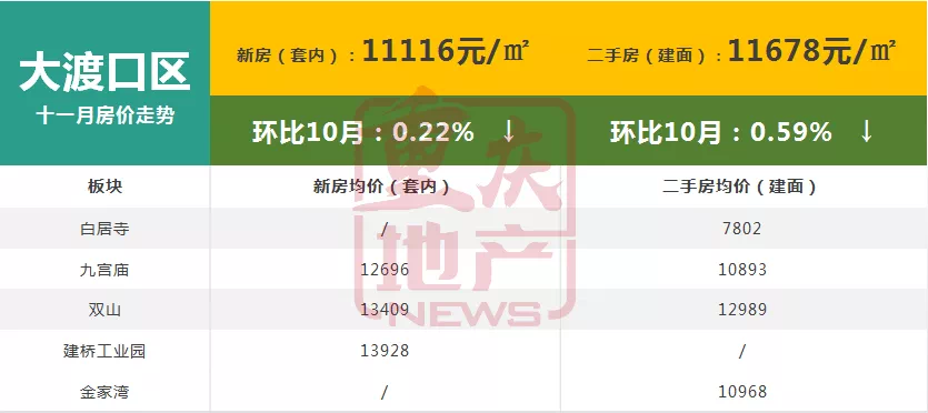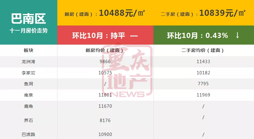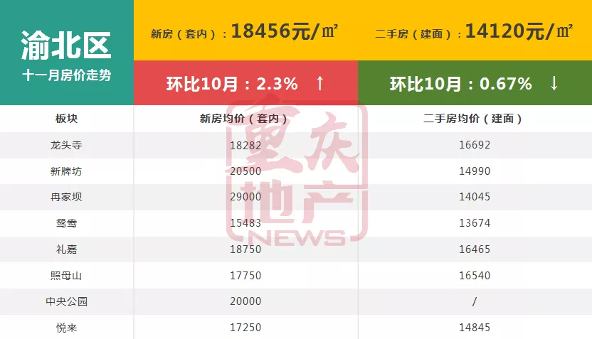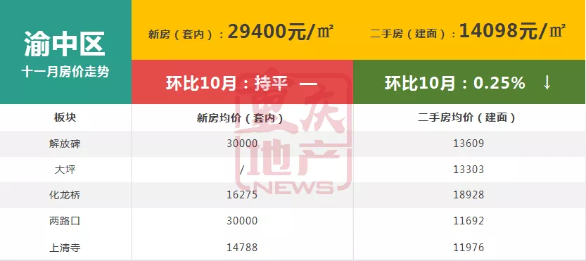 纵观十一月重庆各大区,无论是新房或是二手房,整体房价上下浮动不大。