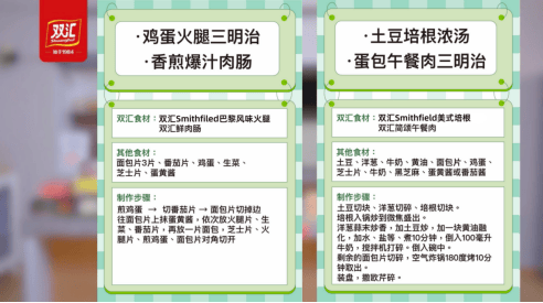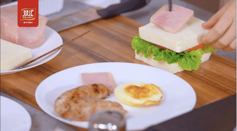 早餐推荐“鸡蛋火腿三明治+香煎鲜肉肠”或“土豆培根浓汤+蛋包午餐肉三明治”,兼顾快捷与能量补充。所用到的双汇巴黎风味火腿精选后腿肉,瘦而不柴且口感非常好;鲜肉肠与简颂午餐肉则无需复杂处理,煎烤即可,帮助快速获取优质蛋白。