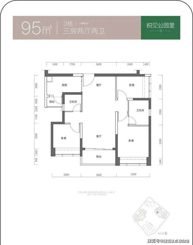 面积有85-88㎡的3房2厅1卫,91-94-95-97-110㎡的3房2厅2卫,120㎡的4房2厅2卫户型
