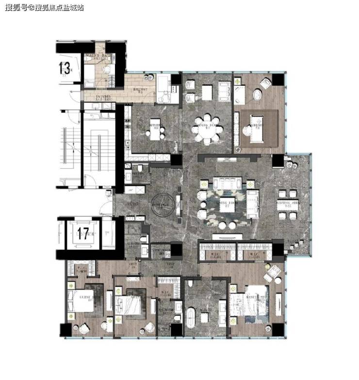 约465㎡户型的公区,采光面加起来近28米,总面积达到了约150㎡,已接近一套200㎡住宅的套内面积,尺度远超同级产品。像汤臣一品那套最大的597㎡,客厅也就120㎡。