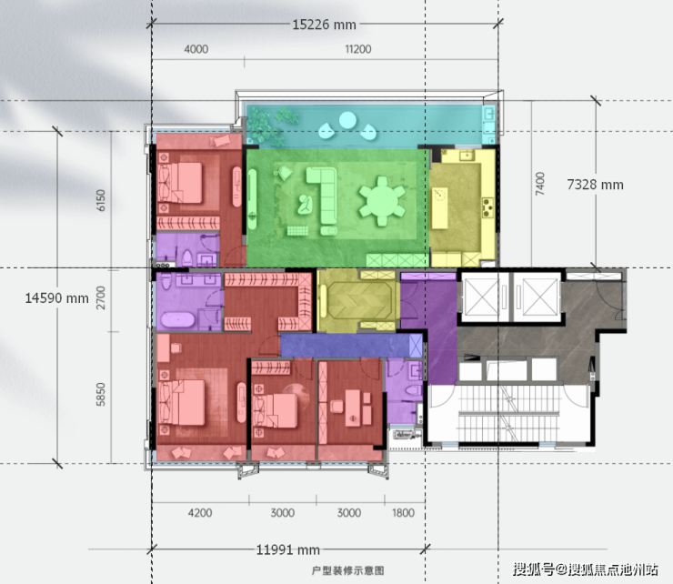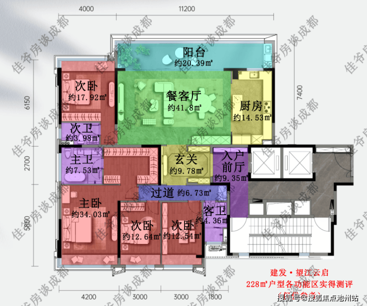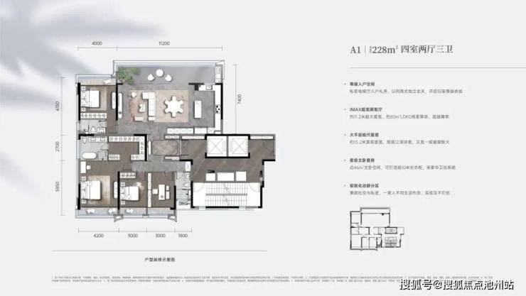 228户型:LDKG一体化设计,面宽约11.2米,几个区域面积加起来近80㎡;主卧也是套房设计,实际可使用面积测得约42㎡,可惜不是270°环幕视野。此外,还有一点比较遗憾,该户型没有生活阳台。