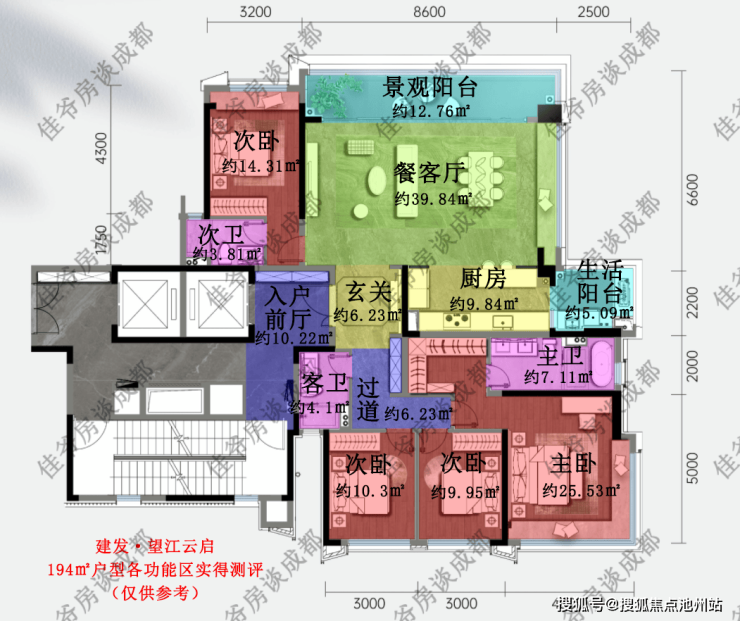 194户型:端厅270°的环幕采光视野,餐客厅+阳台,实际可使用面积测得约53㎡;主卧也是270°的视野,配步入式衣帽间和独立卫浴,实际可使用面积测得约33㎡;其他功能空间的尺度也能保证居住的舒适性。