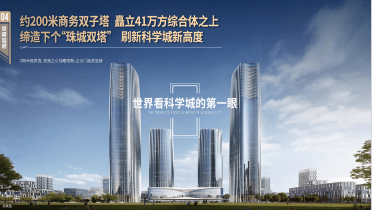 约200米双子塔超甲级办公,刷新科学城高度,打造珠城双塔级地标。