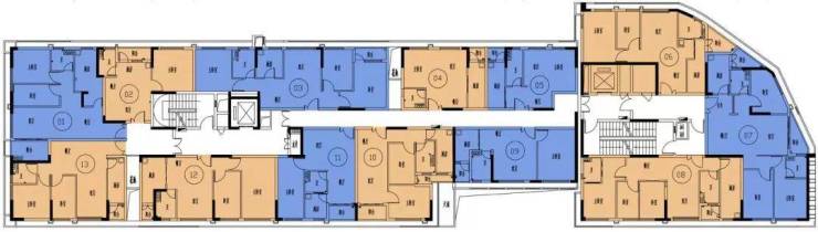 项目首层包括商铺和入户大堂,2层是商业,3-4层是企业总部写字楼,5层是社区公配,6-21层是住宅,2-5层的电梯与住宅的电梯是分开设置,不会相互干扰,住宅面积约70-104㎡两到三房为主,合计154户。