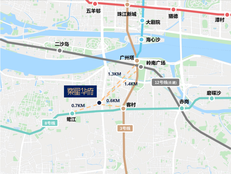 四地铁环绕,广州塔站,岭南广场站(在建),鹭江站(约600米),地铁三、八号线交汇客村站(约700米),两站即到珠江新城,半小时通达全城
