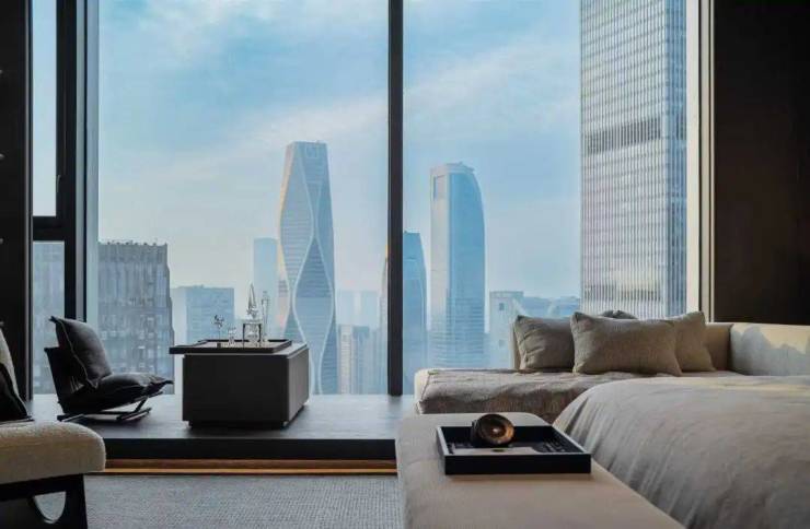 奢侈终归是不断走向内心的静谧,「归屿」真正做到了动静分离。归家映入眼帘的第一视觉便是“静谧怡然”,归家映入眼帘的第一视觉便是“静谧怡然”,270°观景的会客空间,依次排开的5个南向套间,让世纪中轴、日月同辉如同一幅恒景画映入会客厅一幅恒景画映入会客厅,心中的向往之境,也在空间的自然流动中舒展。