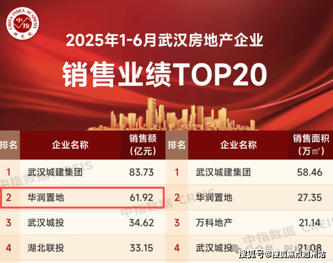 根据中指院相关统计显示,在今年上半年武汉房企销售业绩榜中,华润置地以61.92亿元位列第二,仅次于武汉城建集团。