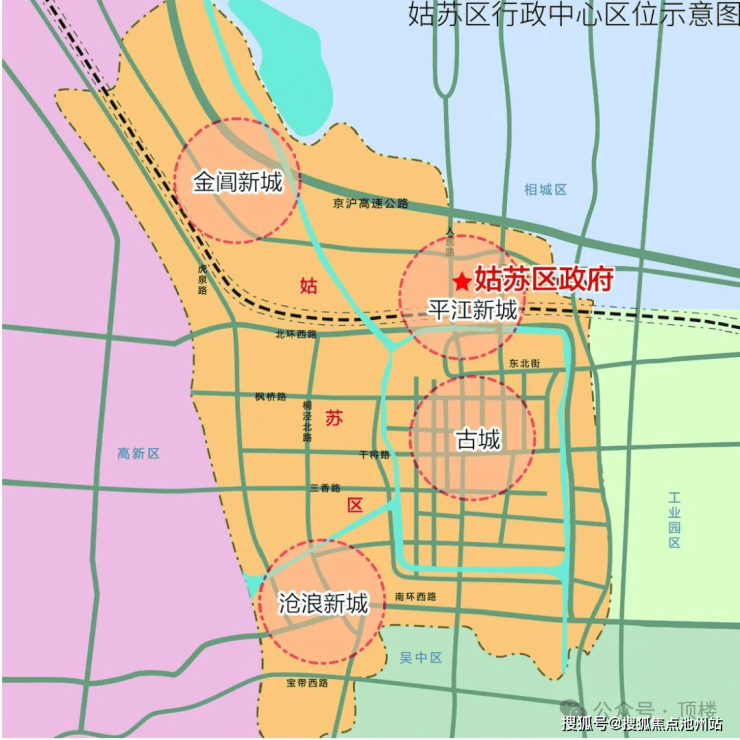 2012年姑苏区政府迁至平江新城,随后苏州市行政审批中心、公共资源交易中心、公积金中心、社保基金中心等9大市级行政服务机构相继迁入,平江新城成为姑苏区的行政中心