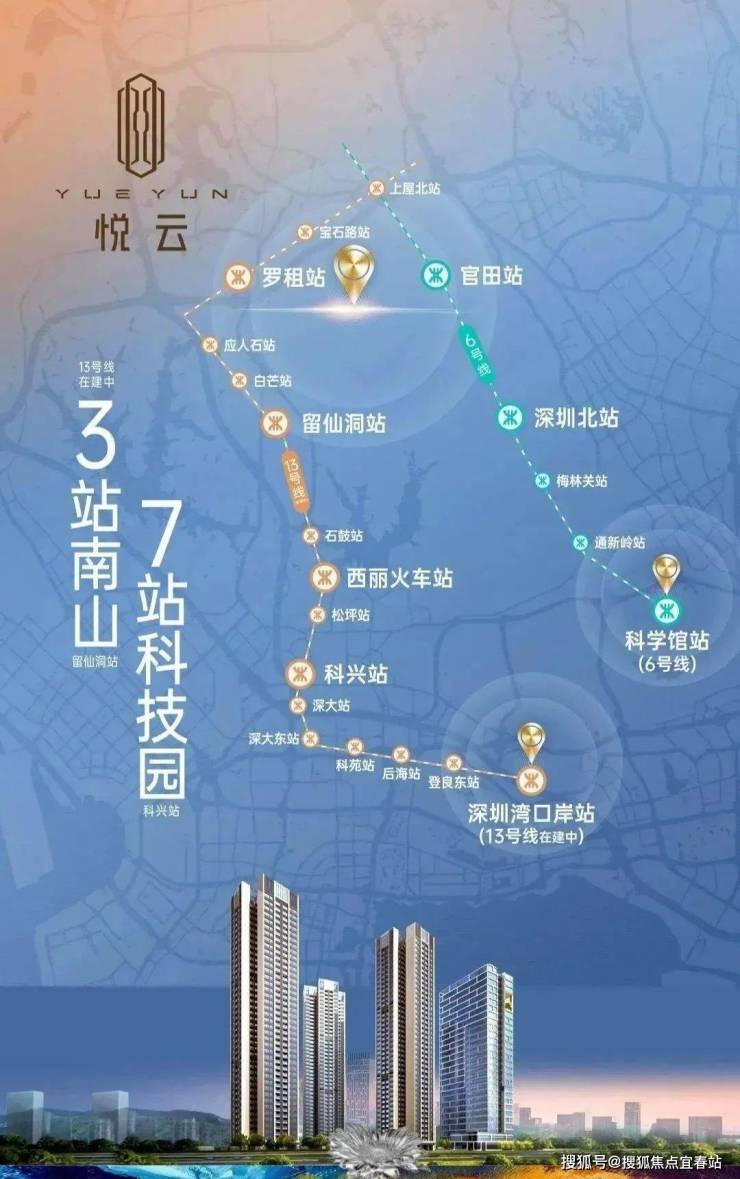 13号线是一条纵向轨道,连接南山、宝安、光明等片区,未来通车后,从项目出发,3站可达留仙洞总部基地,6站达高新园,12站到深圳湾,大大拉近与南山商务区和核心区的距离。项目东北侧有地铁6号线官田站,但该站点距离相对较远,根据地图测距,直线距离约1.6公里,步行距离约2.4公里左右。