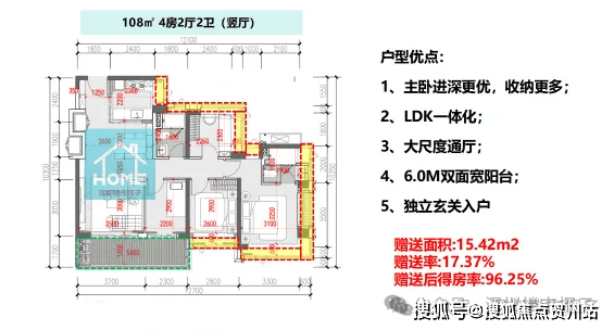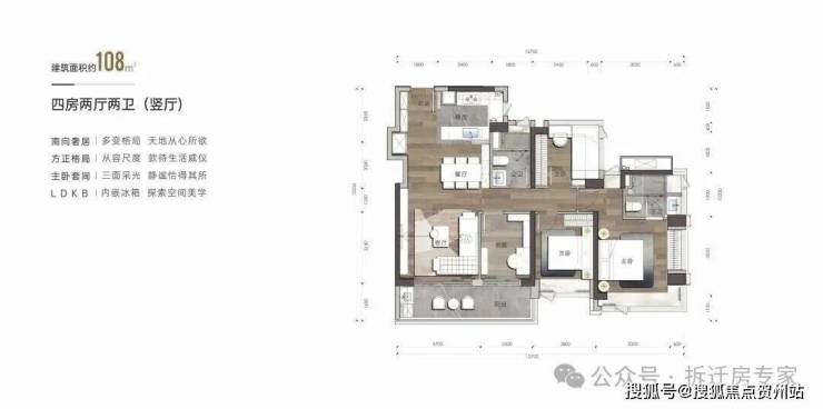 建筑面积约108㎡户型-4房2卫(竖厅)
