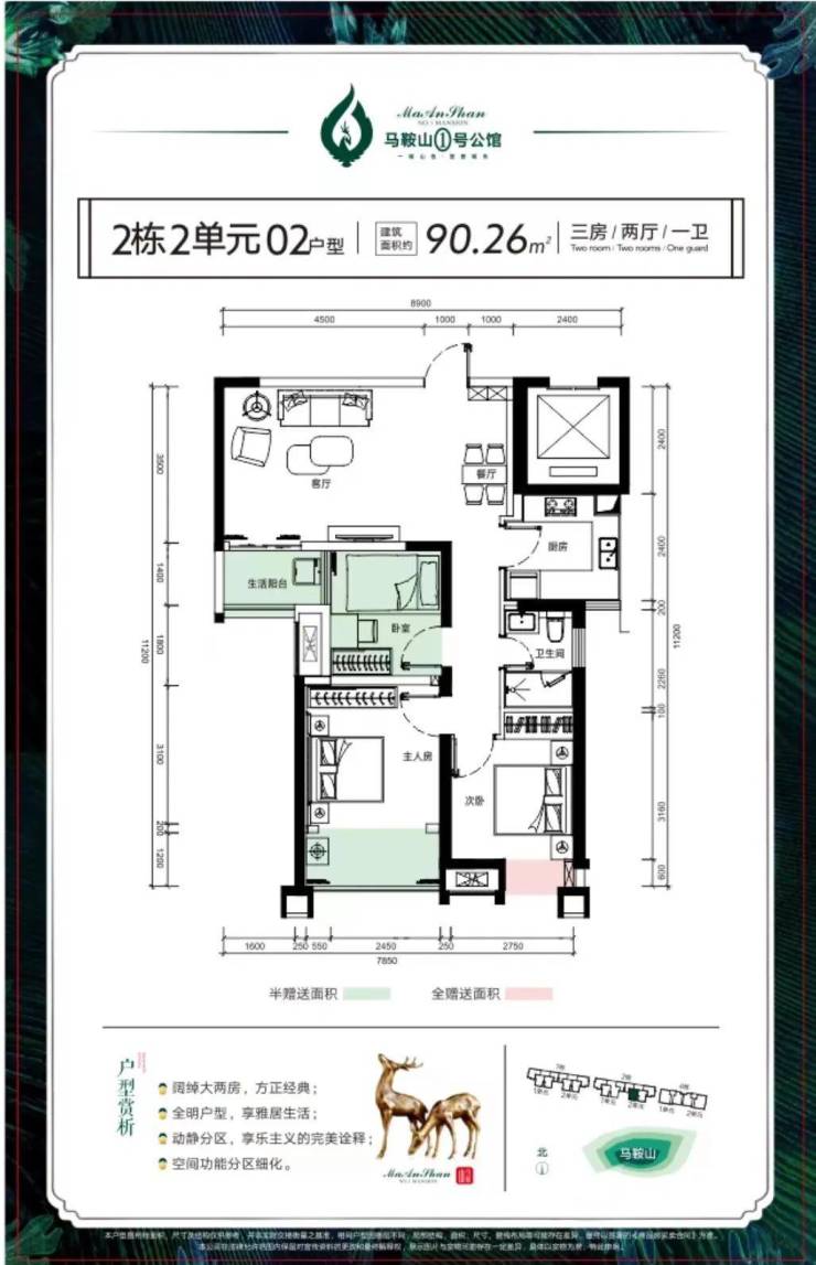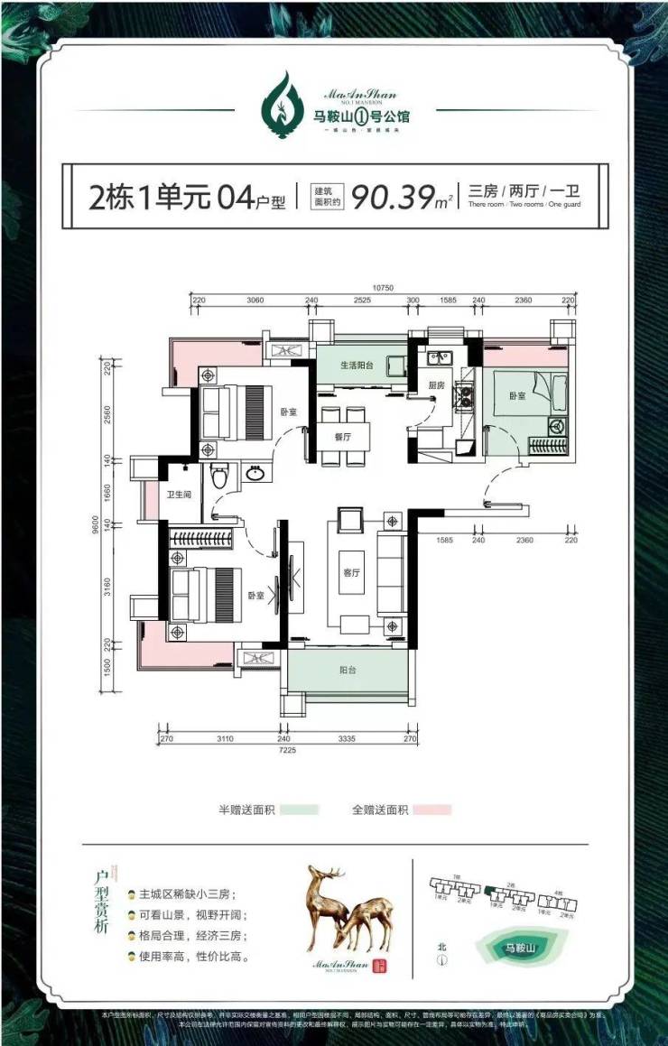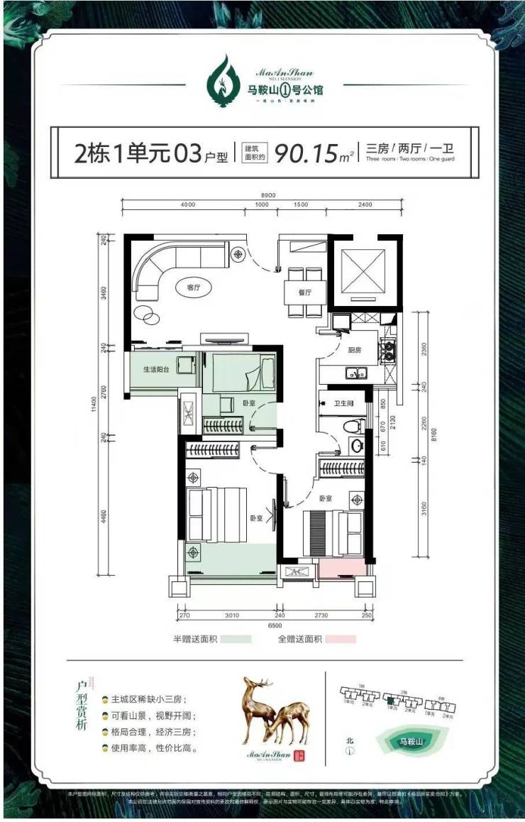 板楼设计,通风采光一流,正南正北朝向,南向看澳门,北向看凤凰山。