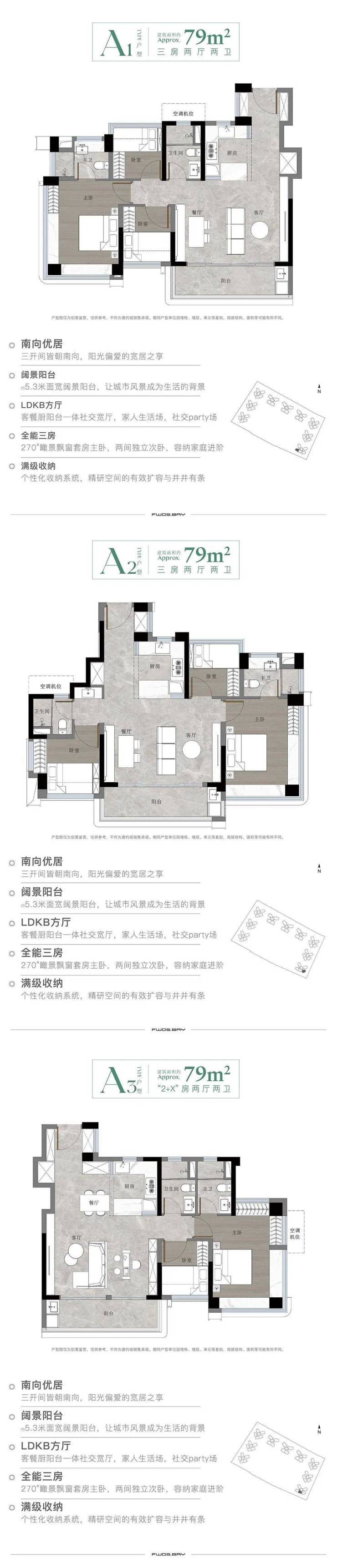 高使用率户型:项目采用全南向设计,79平三房带大阳台,使用率超100%,户型方正,采光通风俱佳。