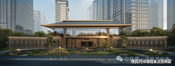 建筑立面以观澜屏玻璃立面辉映江水波澜与天际浩瀚,香槟金格栅是鎏金显贵,黄金缕线条流畅灵动,新中式韵律之美点缀CBD天际线。