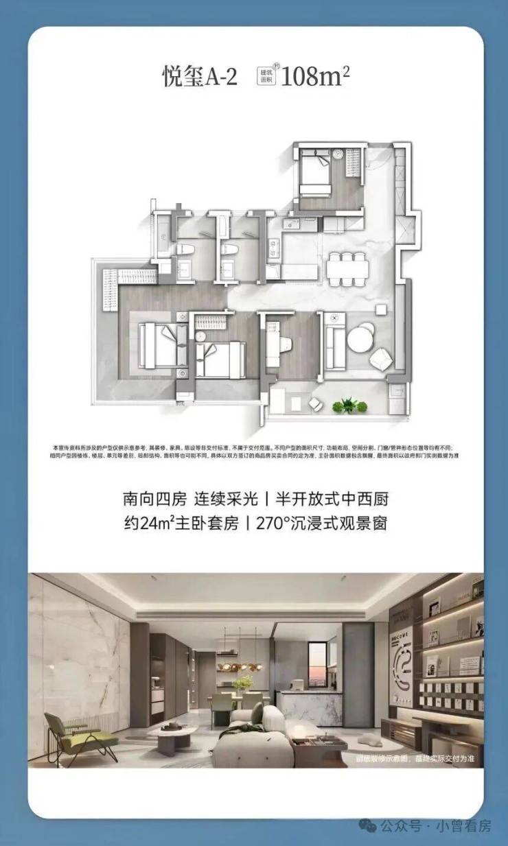 刚需家庭可以关注 108㎡的四房户型,总价 600-670 万左右,进门有灵动空间可作为茶室或客卧,U 型厨房带岛台设计让烹饪动线更流畅,主卧的 270°U 型飘窗带来不错的采光和视野。