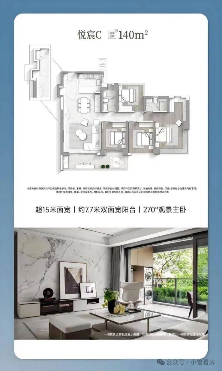 140㎡的户型有两种设计,一种是约 8.4 米的双面宽阔景阳台搭配南北对流主卧,另一种做到超 15 米户型展宽,四开间朝南,7.7 米阳台让室内采光充足,客餐厨一体化布局适合家庭互动。