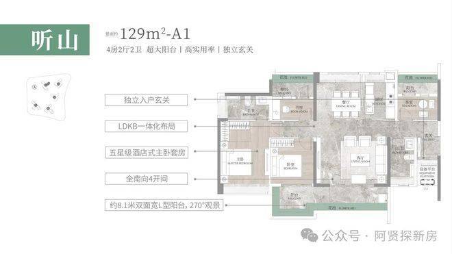户型设计极具竞争力,建面 108-165㎡3+1 至 4+1 房,得房率接近 100%,3.1 米层高搭配全景落地窗,采光通风极佳。其中 108㎡3+1 房四开间朝南,近 6 米南向阳台 + 5.9 米 LDKB 方厅;165㎡4+1 房双主套设计,17.4 米南向面宽 + 9 米 L 型景观阳台,三面望山景,空间尺度媲美豪宅。社区配套完善,打造全明精装地库、负一层社交入户大堂及首层 7 米挑高精装大堂,风雨连廊串联归家空间;外揽山体公园、天河儿童公园等五大公园,人均公共绿地 13.4㎡,三面环山(大灵山、长岗山、横山),负氧离子充沛,生态宜居属性拉满。