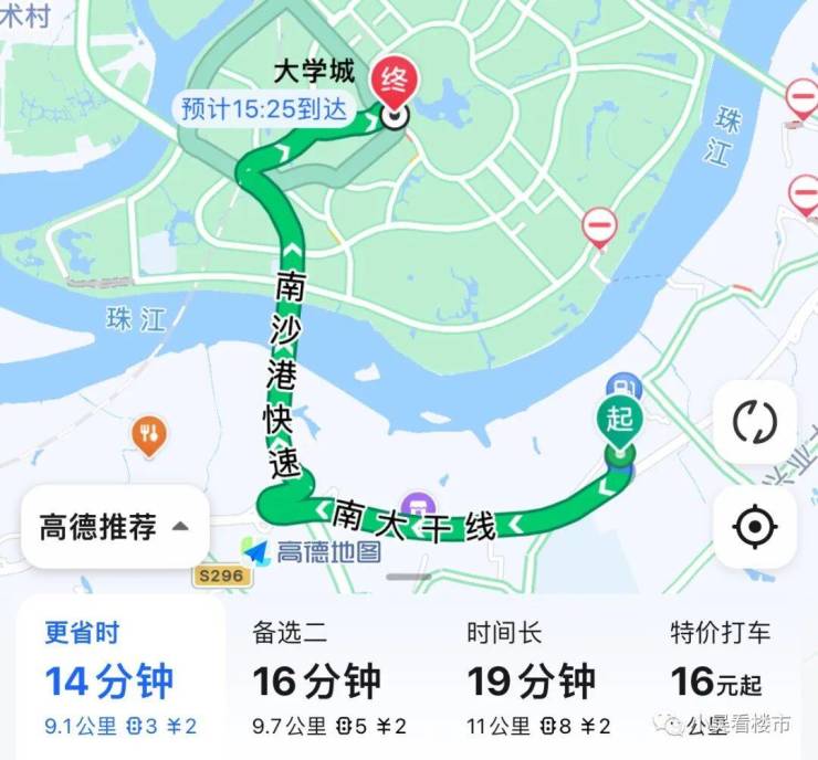 自驾去大学城:走高速的情况下,上南大干线转南沙港快速,全长9.1公里,高速费2元,耗时14分钟左右。