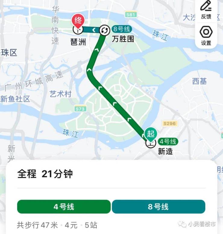 地铁前往琶洲:乘坐4号线4个站到万胜围换乘8号线,全程5个站,总共耗时34分钟左右。