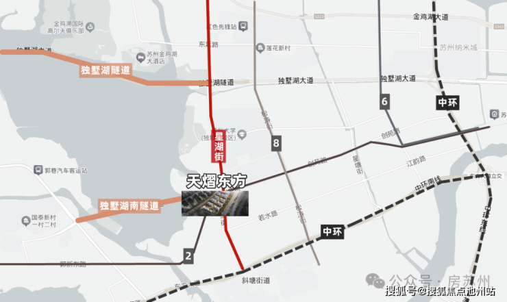 地铁2号线、6号线、8号线纵横交错,织就便捷的交通网络;主干道星湖街+独墅湖隧道/独墅湖南隧道+中环,“一主两隧一环”实现与各大区域无缝衔接。