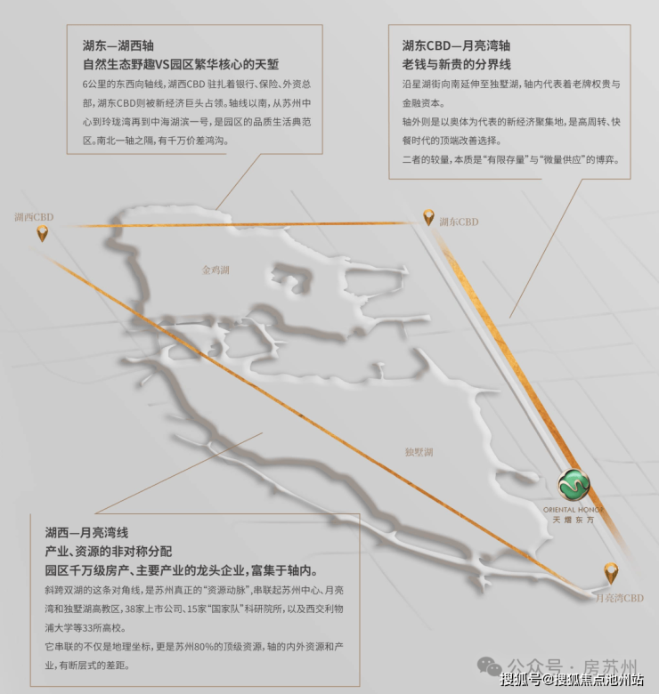 湖东CBD一月亮湾轴=老钱隐贵与新贵的分界线,沿星湖街向南延伸至独墅湖,轴内代表着老牌权贵与崇尚生态的隐贵圈层;