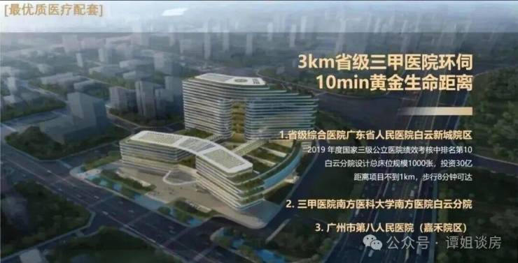 项目3公里内三甲医院有广东省人民医院白云新城院区、南方医科大学南方医院、第八人民医院嘉禾院区等三甲医院。