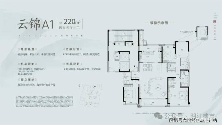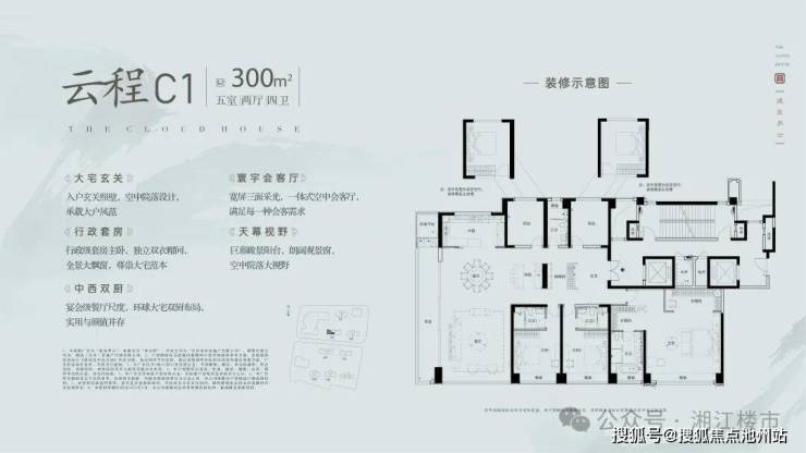 户型方面,从约220㎡四室两厅三卫,到约300㎡五室两厅四卫,每一款都布局合理。约300㎡户型的270°寰宇会客厅,让你俯瞰城市繁华与天地浩瀚。