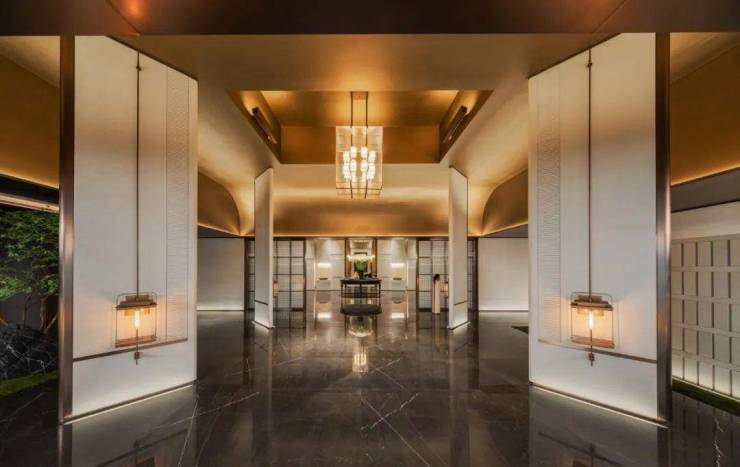 大厅前是一个高阔的空中艺廊,层高约4.2米,铺就白色温润玉石,用料奢华。