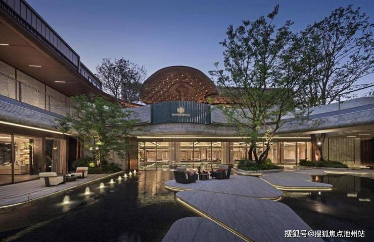 园林以"长江揽胜,琢玉之境"为理念,融合国际度假酒店的松弛感与都会奢华酒店的精奢美学,打造六大主题场景。核心的"玉瀑鸣涛"垂直水景,以4米高叠瀑点睛下沉庭院的视觉焦点;樱花玉廊对望亭内,青玉格栅屏风与和氏璧纹样地面相映,演绎"玉影浮光"的东方意境。在这里,归家即是度假,下楼即是风景。