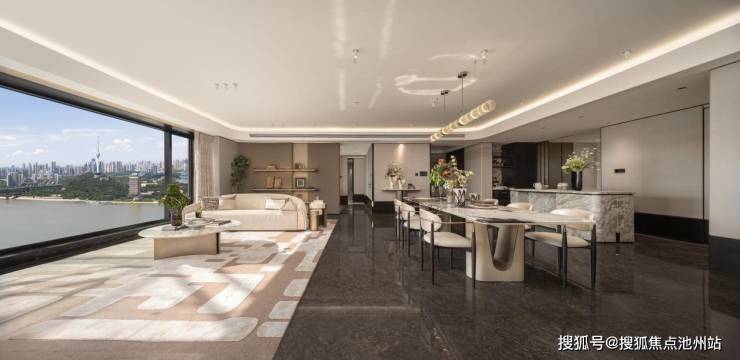本次开放建面约244㎡和约198㎡户型样板间:推窗即见浩瀚江面与城市地标;客厅采用270°环幕玻璃幕墙,将长江十景与城市地标尽收眼底,带来无界的视觉震撼。