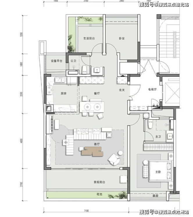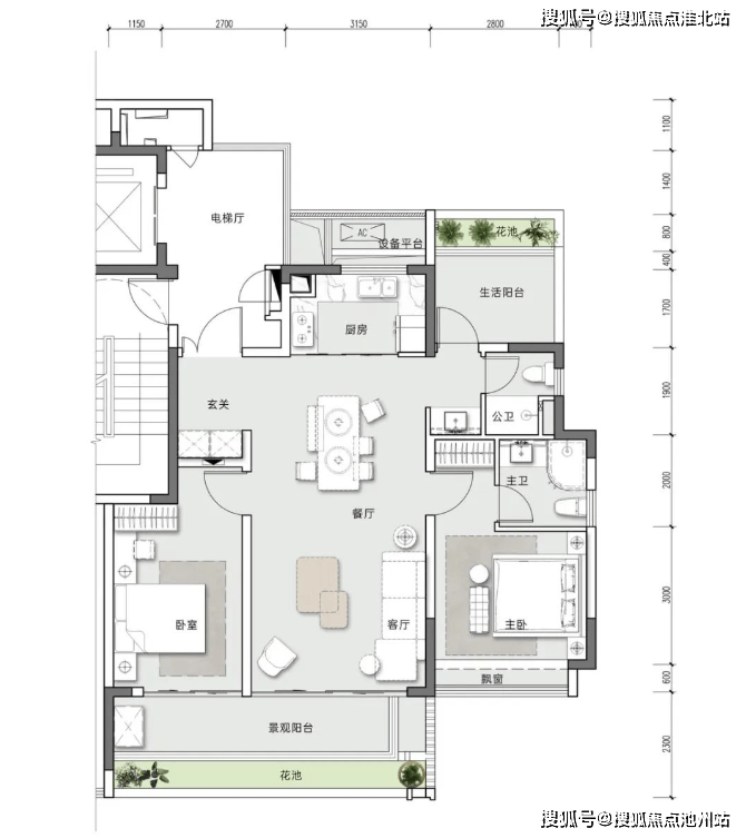 110㎡边户:景观宽厅户型,客厅 270 度景观窗,约 6.5 米宽厅奢阔大气,主卧大套间私密尊崇。