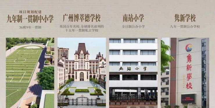 项目 074-1 地块配建 36 班九年制学校,074-2 地块配建 9 班幼儿园,周边还有广州博萃德学校,涵盖了从幼儿教育到九年义务教育以及国际教育等不同类型的教育资源。