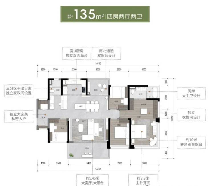 135㎡户型:南北对流双阳台,三代同堂无忧